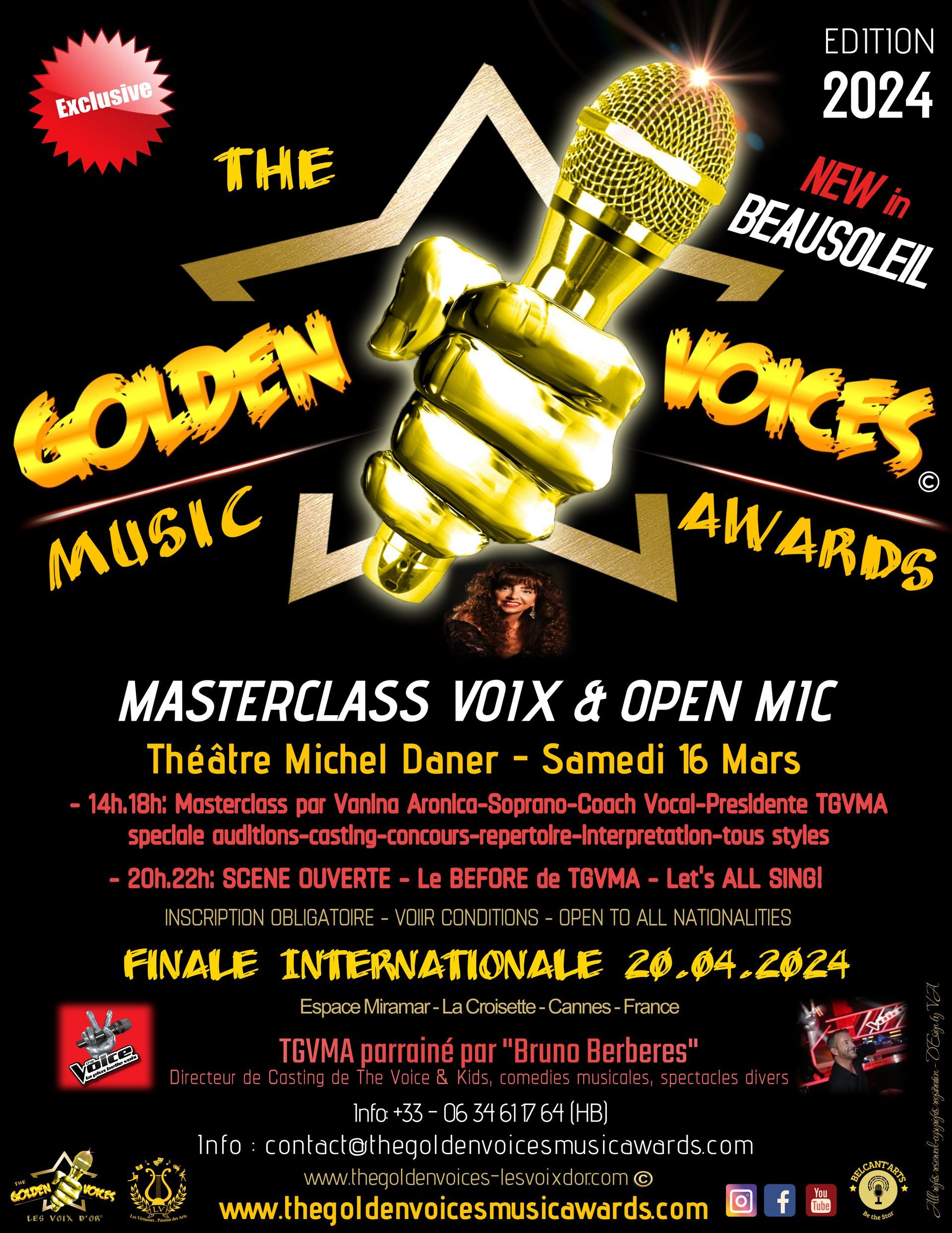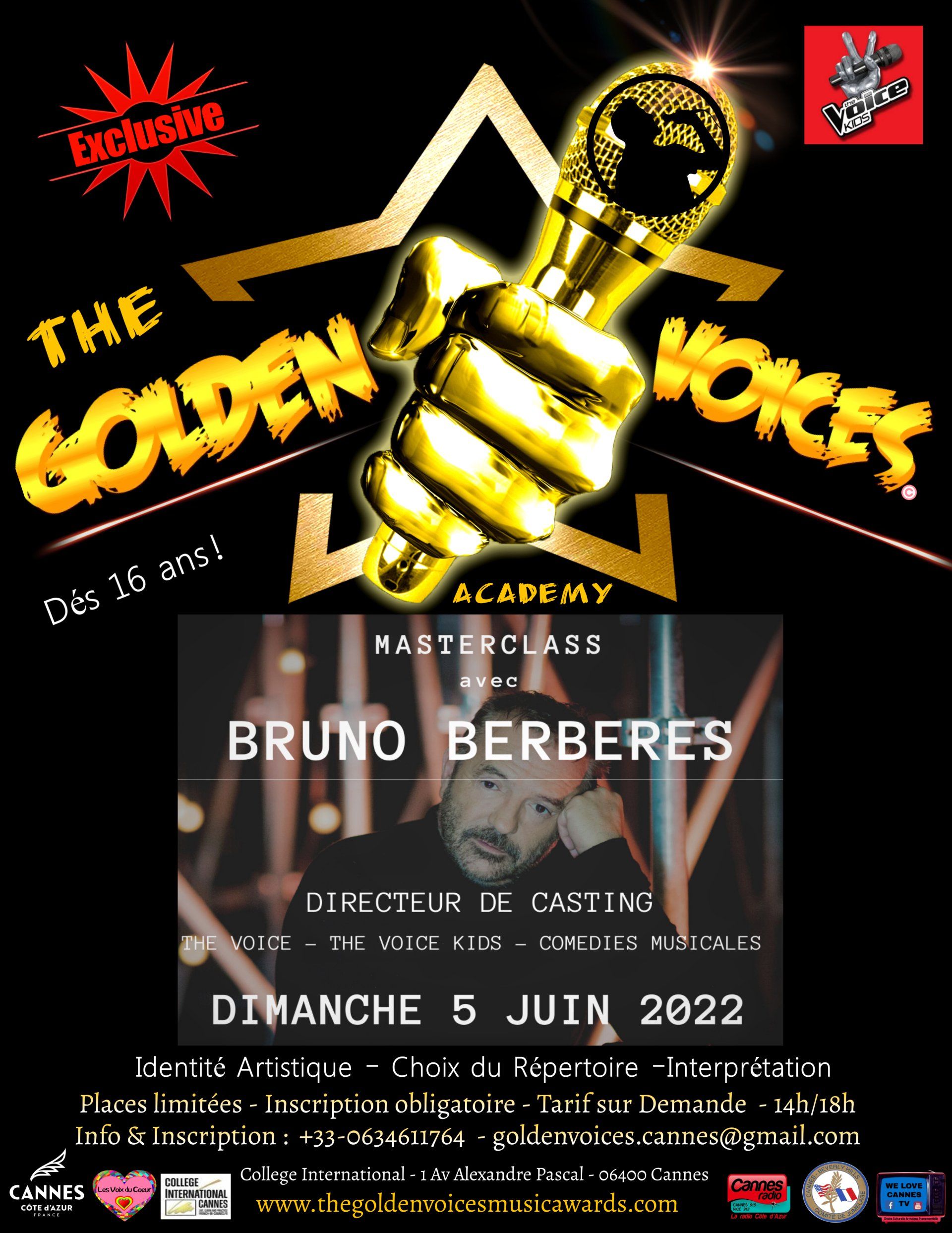 Compétition de chant Internationale parrainée par Bruno Berberes, le directeur de casting de The Voice France, entourée d'un jury de professionnels renommés, artistes, directeurs artistiques et producteurs réputés, le label MFF et de nombreux partenaires dont la ville de Cannes. "The Golden Voices Music Awards" est une marque et un concept déposés, tous droits réservés.